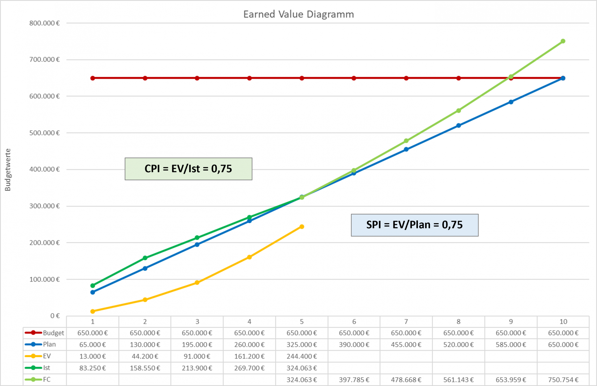 In der Fachliteratur werden unterschiedliche Methoden beschrieben. Für unser einfaches Beispiel nehmen wir den prozentualen Fortschritt aus dem Projektplan und multiplizieren ihn mit dem Projektbudget. Das sollte in Projekten mit klassischer Umsetzung machbar sein.