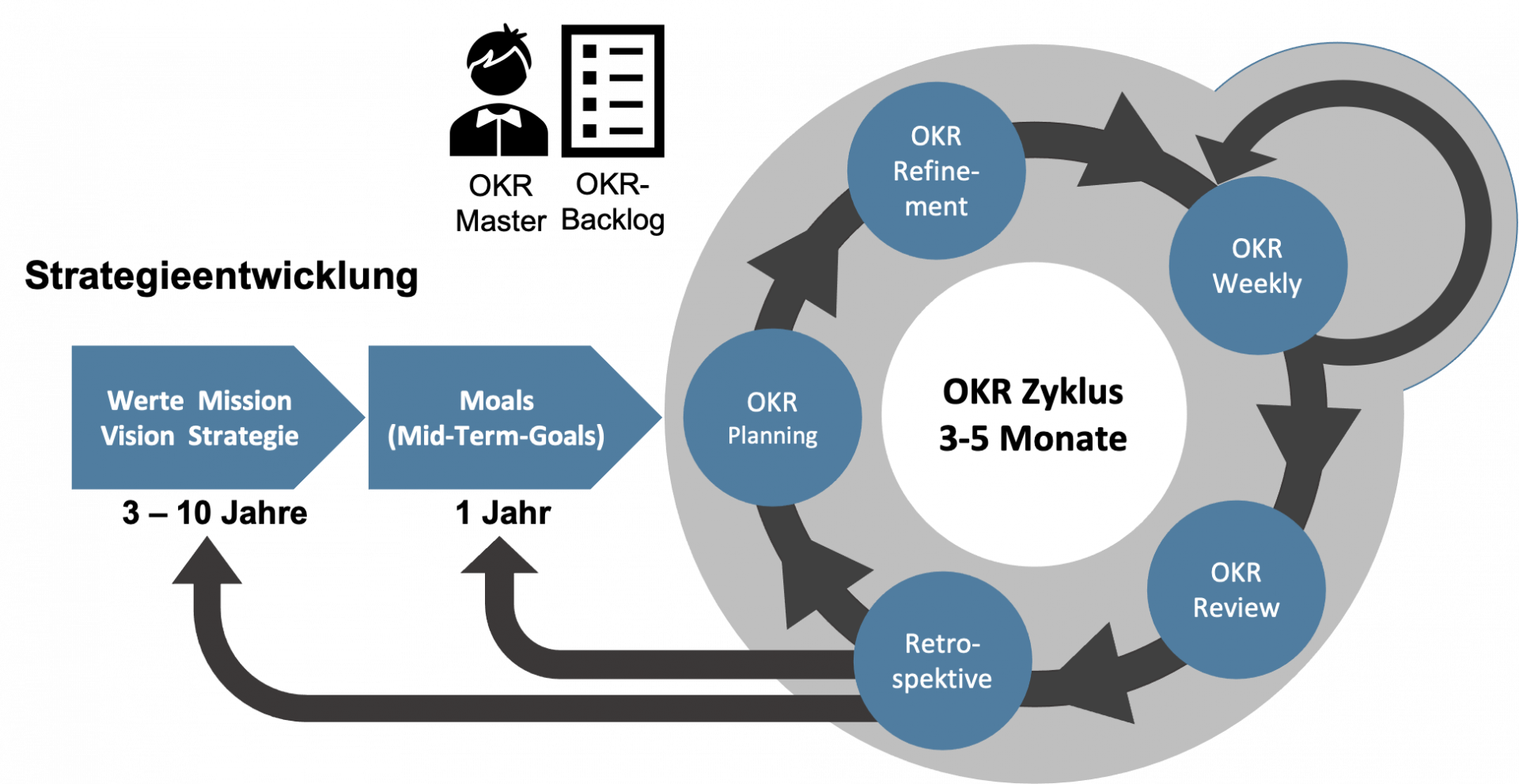 Der Rahmen für alle OKR Events nennt sich OKR Zyklus. Er besteht aus dem OKR Planning, dem OKR Refinement, dem Weekly OKR, dem OKR Review und der OKR Retrospektive.