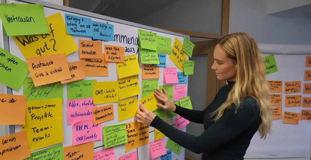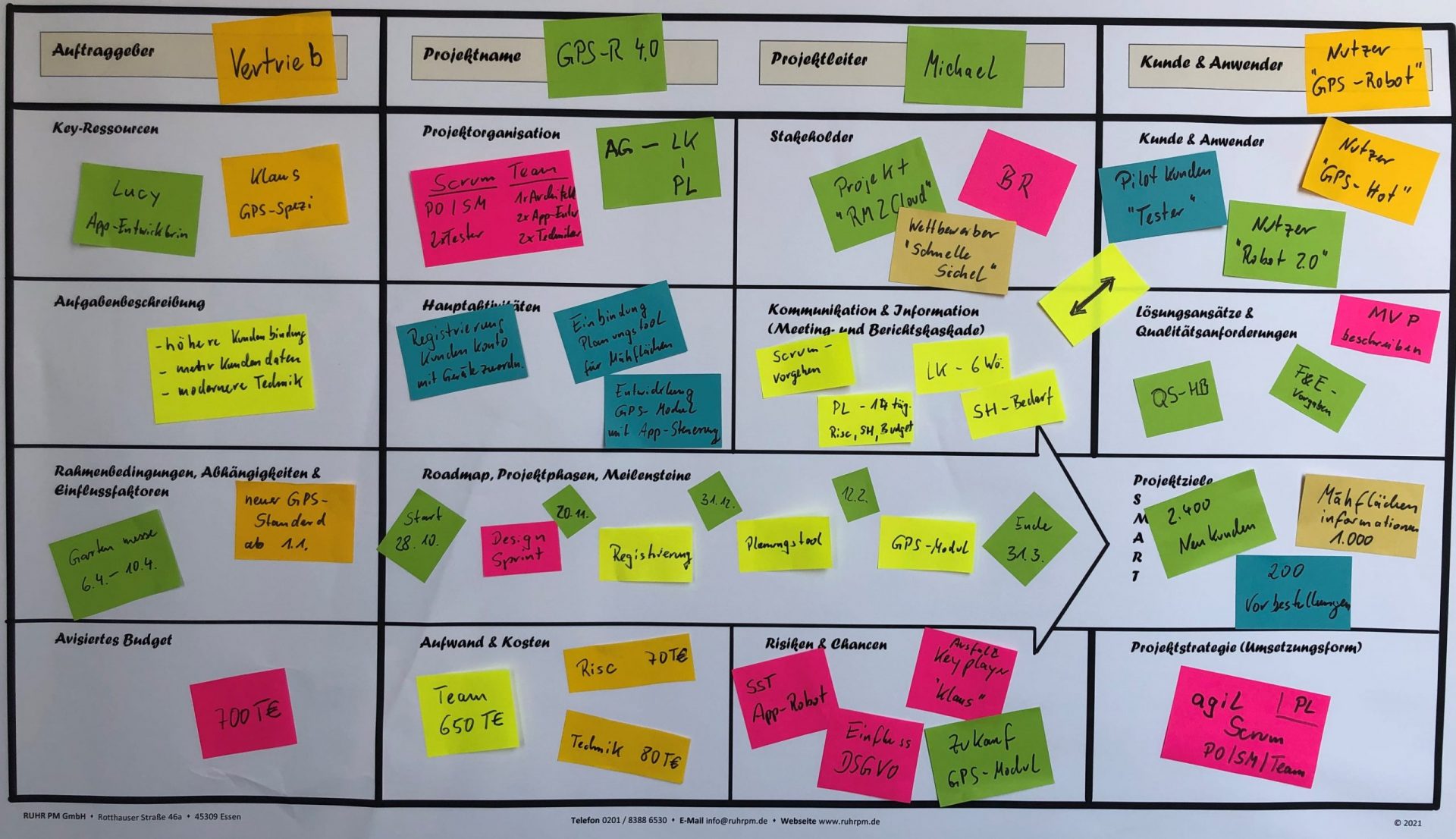 Daher lässt sich der Projektauftrag nicht einfach von „oben nach unten“ abarbeiten. Die Erstellung des Projektauftrages erfolgt iterativ. Das Team-Wissen ist dabei sehr gefragt. Wenn diese komplexen Abhängigkeiten visuell transparent gemacht werden, lassen sich die Abhängigkeiten besser verstehen und darstellen.